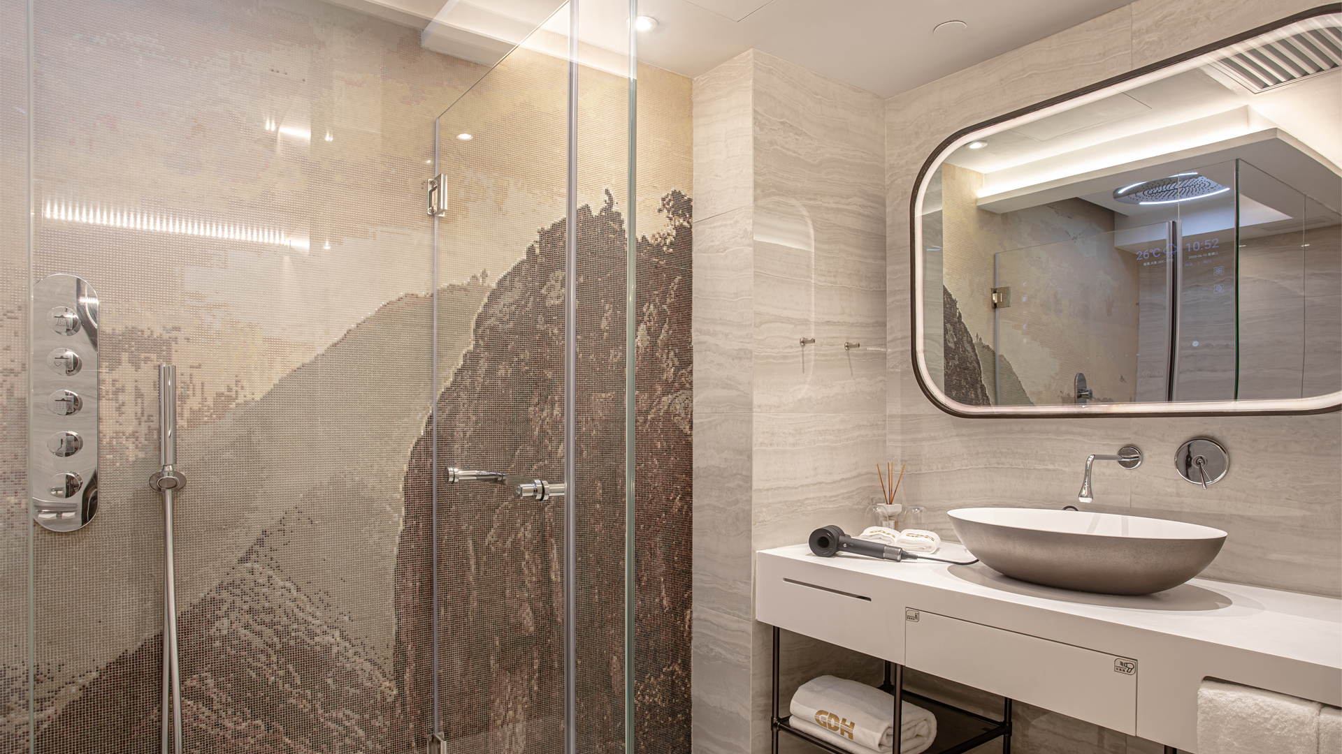 Based on the theme ‘Meet Beautiful Hong Kong at Oasis Avenue’, the guestroom displays the works of local photographer, and even inside the bathroom, you can find a creative mosaic wall showcase a view of Lion Rock or Tsing Ma Bridge.