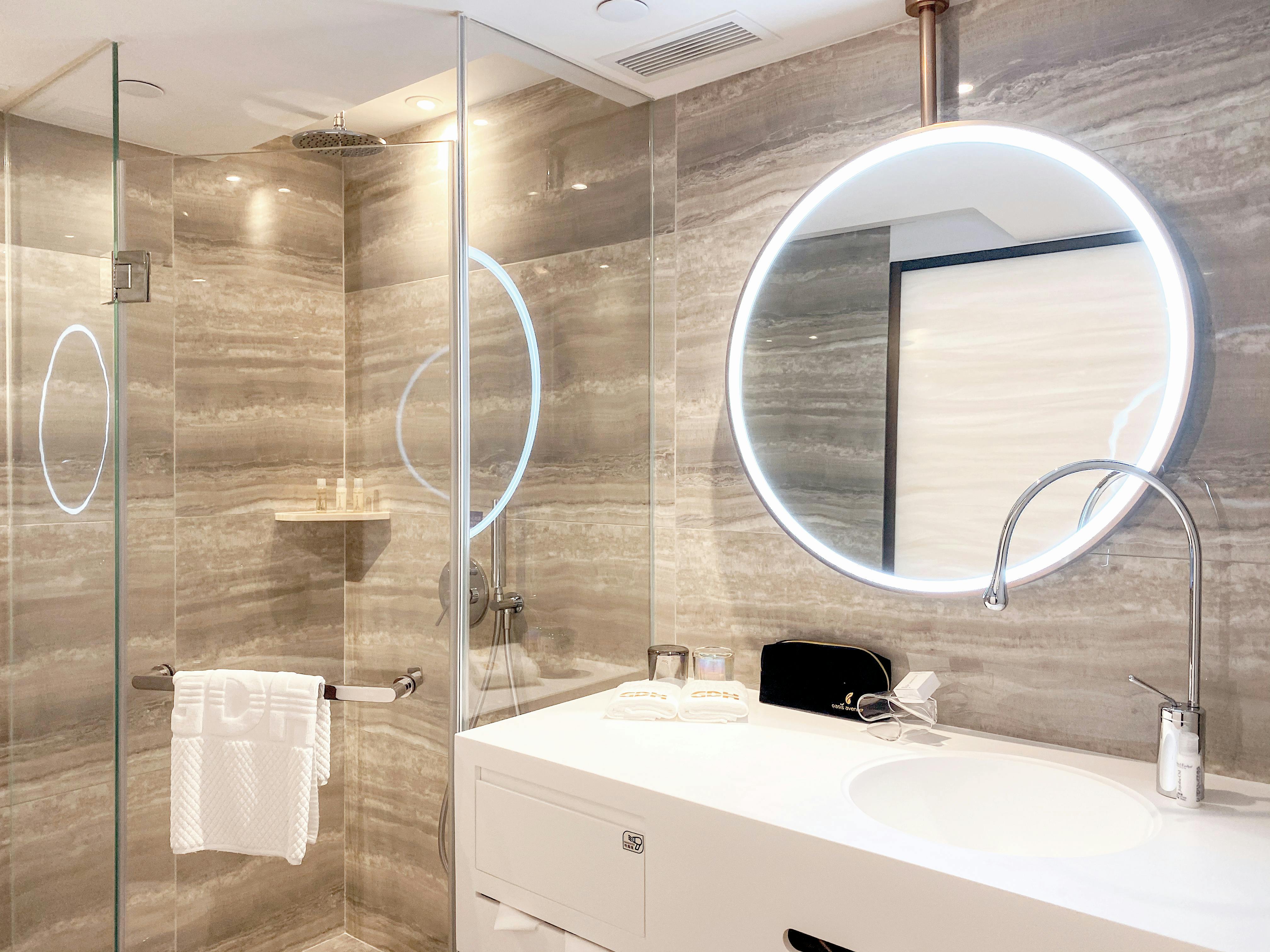 房間均設55~65 吋智能電視,客人不僅能將手機等設備投屏至電視播放音樂或電影,亦可登入Netflix賬號,享受沉浸式觀影體驗。房內衛生間配備Dyson風筒以呵護來賓秀髮。採用Gessi淋浴系統,提供舒適的沐浴環境;亦設TOTO智能一體化座廁,做到“關愛至微”。
