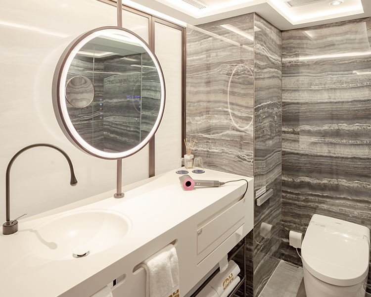 房間設55~65 吋智能電視,客人不僅能將手機等設備投屏至電視播放音樂或電影,亦可登入Netflix賬號,享受沉浸式觀影體驗。房內衛生間配備Dyson風筒以呵護來賓秀髮。採用Gessi淋浴系統,提供舒適的沐浴環境;亦設TOTO智能一體化座廁,做到“關愛至微”。